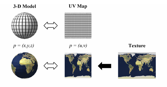 After having an UV map we can apply the 2D texture onto the map by linking the UV coordinates of the UV map with the XY coordinates of the texture image. This will allow a precise placement and manipulation of  textures in 3D.